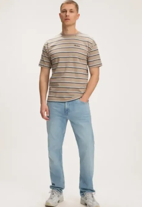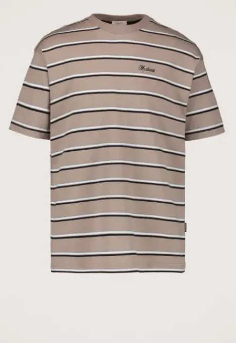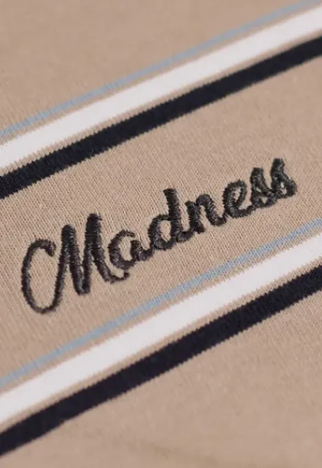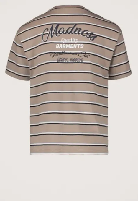 Dit is het Murray T-Shirt van het merk Madness. Het T-shirt heeft een loose pasvorm, een ribboord ronde hals en korte mouwen. Verder heeft het T-shirt een streeppatroon, een geborduurd Madness logo op de borst en een rubberen en geborduurde print op de rug.