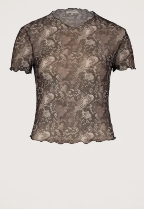 Dit is het Marlena T-Shirt van het merk Madness. Het mesh T-shirt heeft een ronde hals, korte mouwen en is gemaakt van een stretch stof. Verder heeft het T-shirt een all over print en geruffelde zoomen.