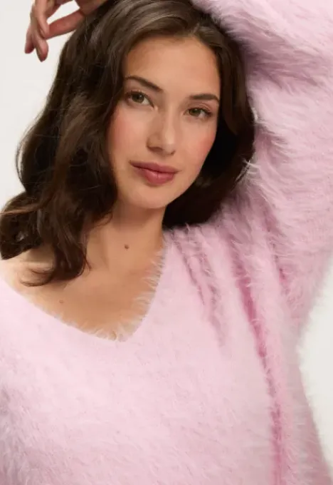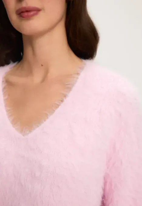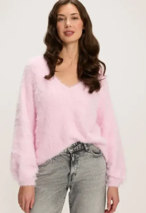 Dit is de Philis Trui van het merk Silvercreek. De trui heeft een V-hals en een plooi op de mouw. Het item is gebreid en is fluffy.