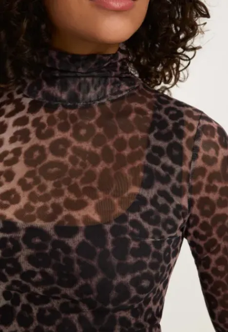 Dit is de Meredith Longsleeve van het merk Madness. Deze mesh longsleeve met col heeft een all over panter print. Het item is nauw aansluitend, heeft stretch en de col heeft een scrunched detail.