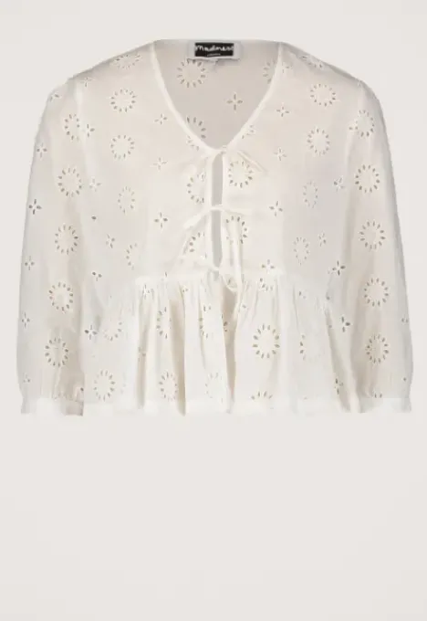 Dit is de Minzy Blouse van het merk Madness. De blouse heeft een V-hals en driekwart mouwen. Verder kan je de blouse aan de voorkant dichtmaken door middel van drie strikjes. Het item heeft aan de onderkant een ruffle en heeft een all over broderie.
