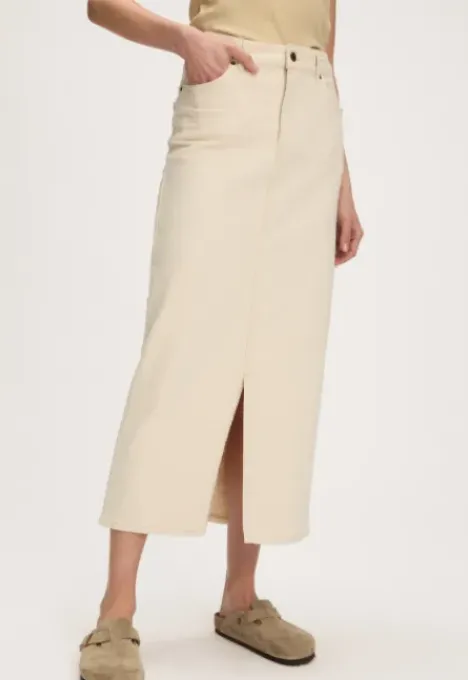 Dit is de B2030300034 Thilou Denim Rok van het merk Silvercreek. De rok heeft een rits- en knoopsluiting. Verder heeft de rok twee voorzakken, twee achterzakken en een split aan de voorkant.