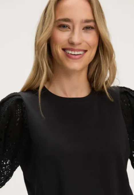 Dit is het Sibel T-shirt van het merk Silvercreek. Het T-shirt heeft een ribboord ronde hals en korte, gehaakte pofmouwen.