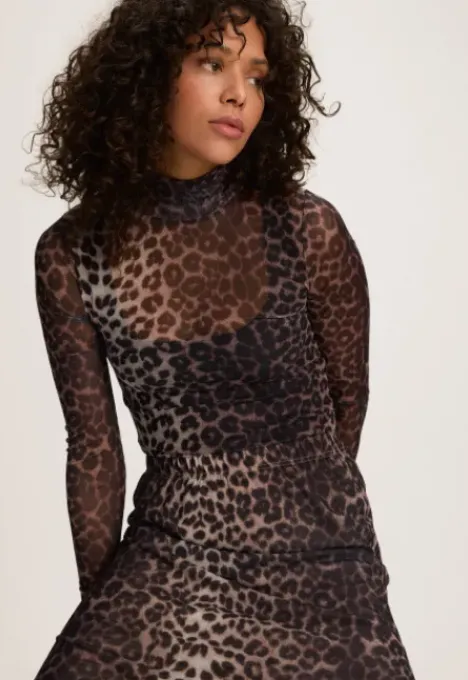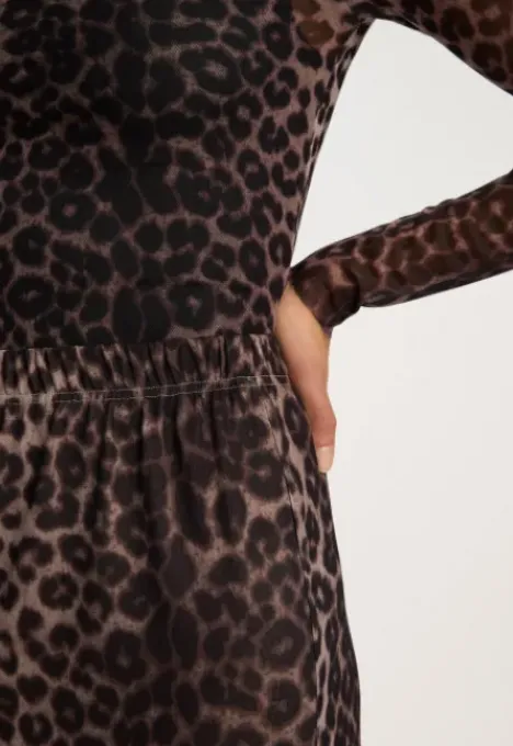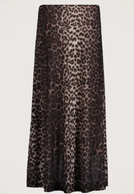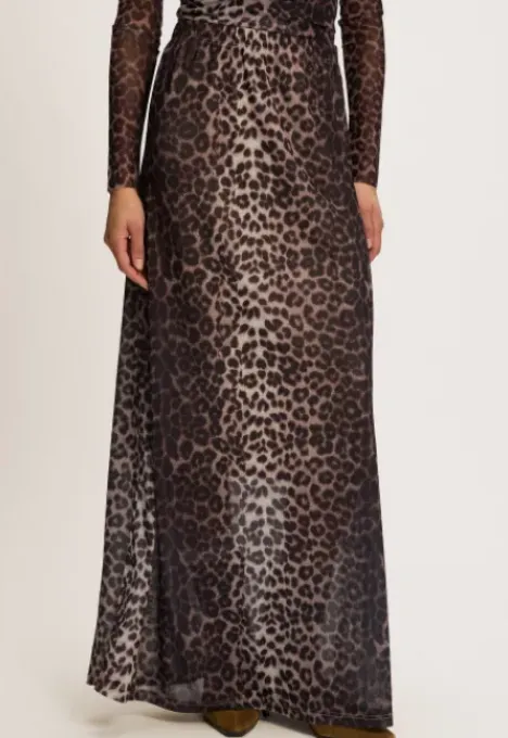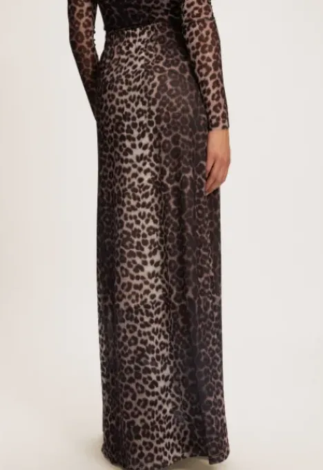 Dit is de Marci Rok Lang van het merk Madness. Deze lange mesh rok heeft een all-over panter print. Het item zit nauw aansluitend en heeft stretch.